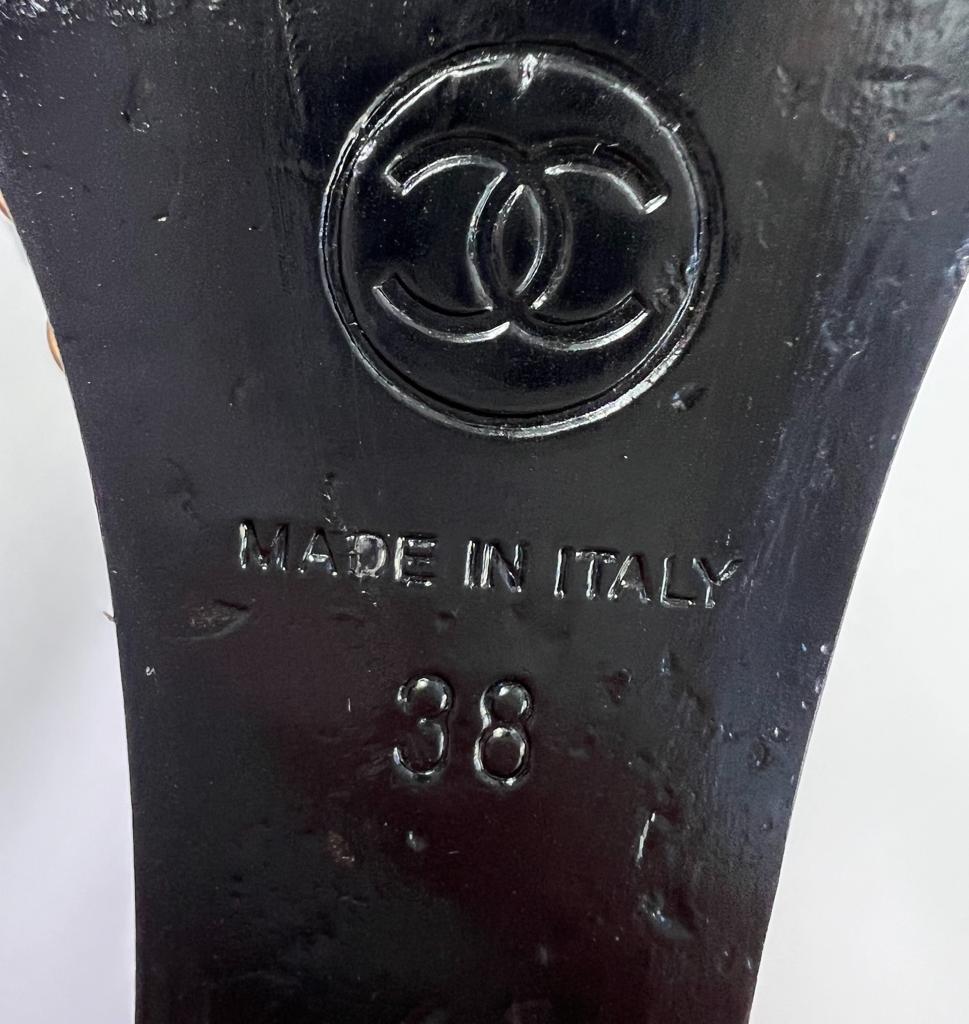 These Chanel boots will give your outfit the chic appeal you've always wanted. Made from black lambskin leather, they feature a wedge heel for comfort with chain around detail and a sleek open toe design , a perfect shoe that combines style and practicality and transitions well from day to night , office wear to weekend festivities,