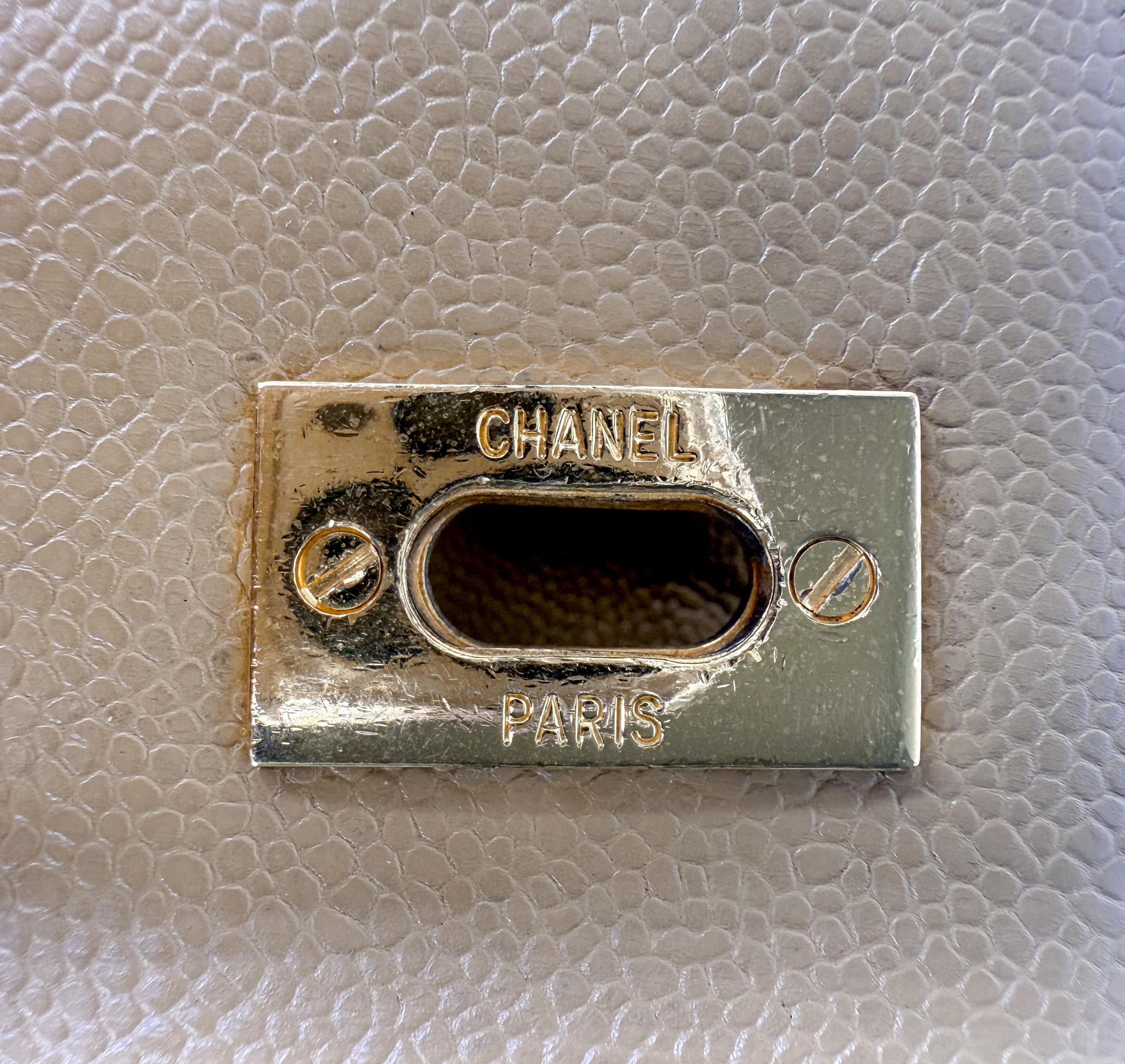 Features : Vintage Chanel Tan CC logo backpack ; from the 1994 - 1996 collection by Karl Lagerfeld , made in Italy from caviar leather, features a large gold tone CC logo, turn lock closure at the front , leather lining and dual interior pockets.