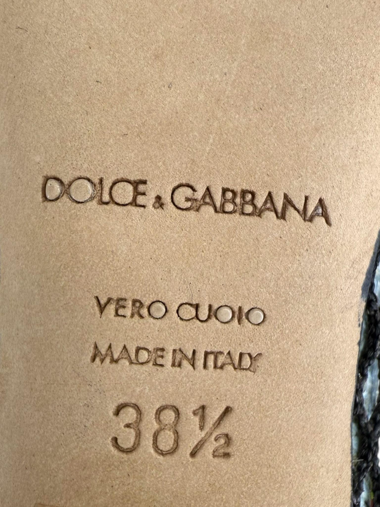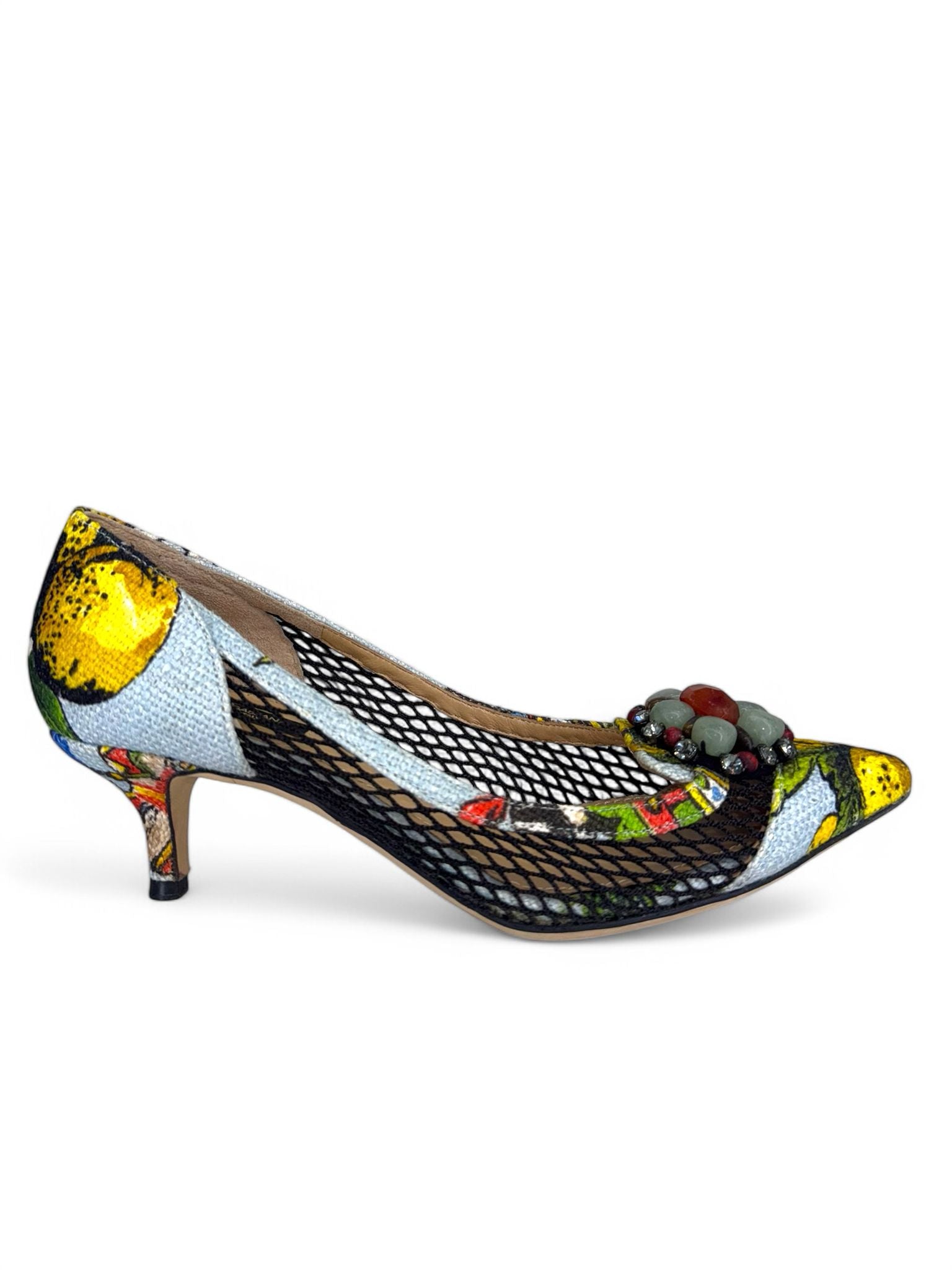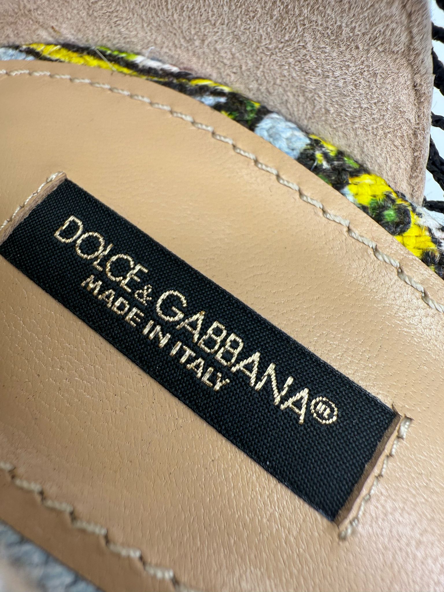 Features : These rare Dolce & Gabbana heels were featured on the Spring 2013 runway. They are crafted from leather and canvas and features pointed toes , a low heel for comfort and stability and the iconic vibrant lemon print with crystal and stone embellishments , the perfect piece for Spring and Summer!