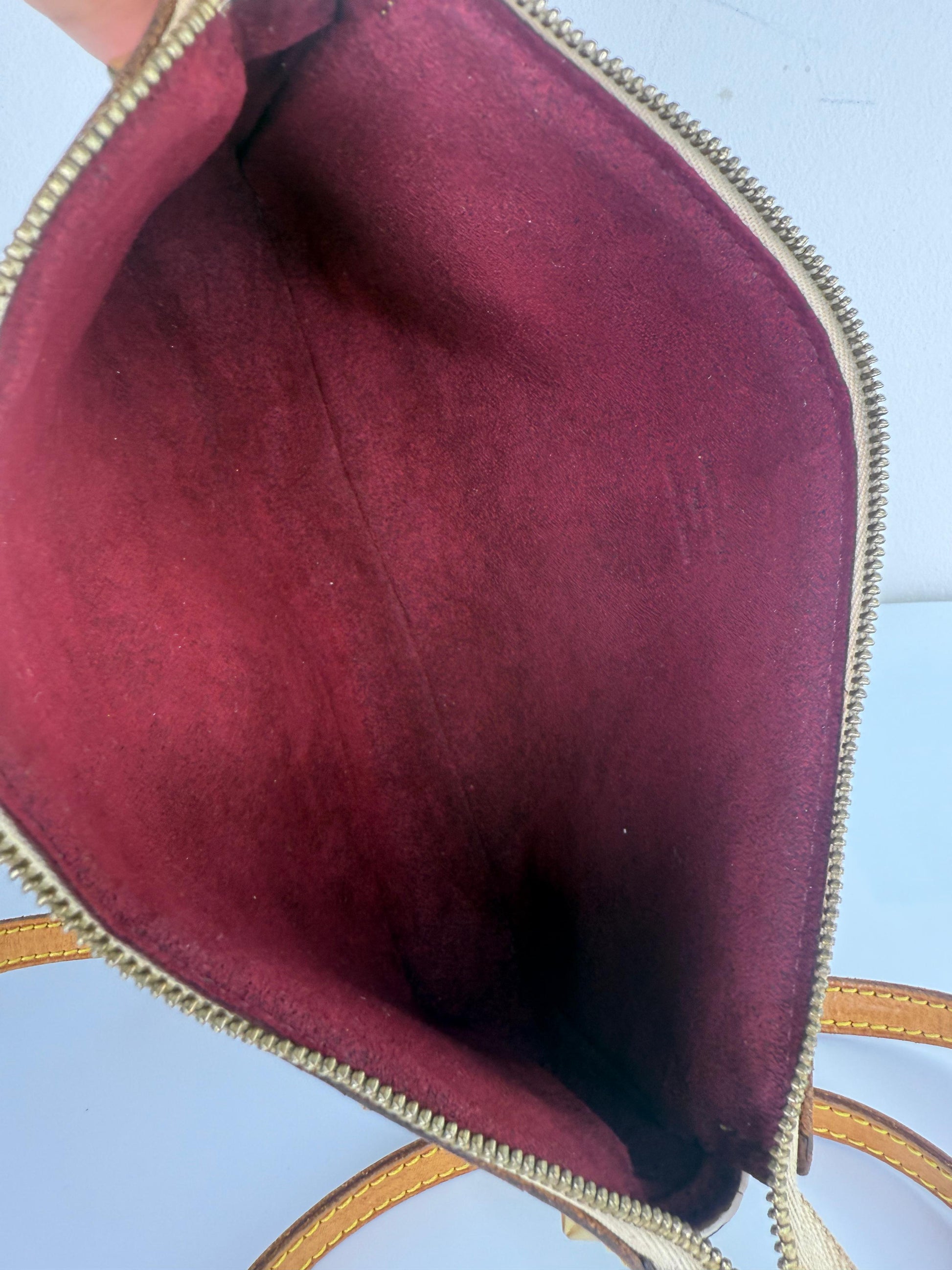Features : This iconic Louis Vuitton Pochette Accessoires is part of the celebrated collaboration with Japanese artist Takashi Murakami, originally introduced in the early 2000s under Marc Jacobs’ creative direction. Crafted from white Monogram Multicolore canvas, the bag features Murakami’s playful reinterpretation of the classic LV monogram — a vivid array of 33 vibrant colors set against a white background. Trimmed in natural Vachetta leather with polished gold-tone brass hardware, this compact yet stylish pochette embodies the perfect blend of luxury and art. It includes a zip-top closure, textile lining, and a detachable leather strap, allowing it to be carried by hand, worn on the shoulder, or attached to a larger bag. A collector’s favorite, the Multicolor Pochette Accessoires has become one of Louis Vuitton’s most sought-after archival pieces, representing an era of bold creativity and pop-art influence in luxury fashion.